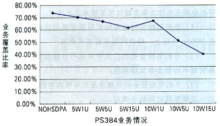由圖1可知,當(dāng)HSDPA分配功率為5W時,HSDPA對網(wǎng)絡(luò)覆蓋沒有很大影響;當(dāng)它為10W時,如果HSDPA用戶數(shù)不大,影響也有限;但是,當(dāng)它為10W時,如果HSDPA用戶數(shù)持續(xù)增加,則會產(chǎn)生嚴(yán)重影響。在下行從NOHSDPA的74%降低到10W15U的40.62%時,PS384業(yè)務(wù)降低了近一半。同時,隨著業(yè)務(wù)速率的提高,網(wǎng)絡(luò)影響越大。另外,在一定的HSDPA功率分配前提下,隨著HSDPA用戶數(shù)的增加,過載率增大,網(wǎng)絡(luò)中高速數(shù)據(jù)業(yè)務(wù)的比例隨之減少,各點上的用戶速率不斷降低;同時,用戶的增多使得各小區(qū)的HSDPA發(fā)射功率不斷增大,導(dǎo)致區(qū)域中間各點的終端接收功率普遍增加。