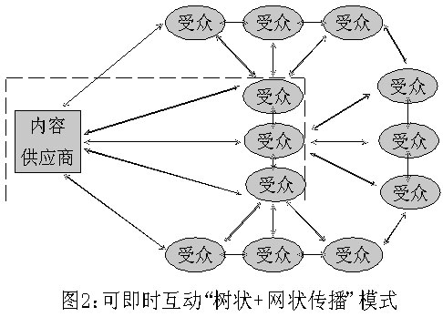 從傳播學(xué)角度分析,傳統(tǒng)媒體傳播方式是“樹狀傳播”,是點(diǎn)對(duì)面的單向傳播,即從一個(gè)信息源(樹根)向受眾(樹葉)作單向傳播(見圖1)。受眾(樹葉)向信息源(樹根)的反饋,是滯后的、非同介質(zhì)的(讀者來(lái)信、來(lái)電等),傳播和反饋不能同步進(jìn)行。而新媒體的傳播方式則是“網(wǎng)狀傳播”,即它是一個(gè)漁網(wǎng)式的傳播網(wǎng),網(wǎng)上的任意一個(gè)節(jié)點(diǎn),都可以向其他任意一個(gè)節(jié)點(diǎn)或節(jié)點(diǎn)群作點(diǎn)對(duì)點(diǎn)、點(diǎn)對(duì)面的單向或雙向互動(dòng)式傳播,傳播者和受眾之間可以即時(shí)互動(dòng),信息反饋可以即時(shí)進(jìn)行,傳和受的位置可以即時(shí)互喚。