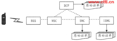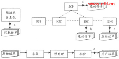 通過對移動點(diǎn)對點(diǎn)短消息計(jì)費(fèi)原理的分析,可以把整個(gè)計(jì)費(fèi)過程劃分為兩大環(huán)節(jié):計(jì)費(fèi)點(diǎn)原始話單的生成和后期計(jì)費(fèi)處理系統(tǒng)的處理。如果其中任何一個(gè)環(huán)節(jié)出現(xiàn)差錯都會降低用戶計(jì)費(fèi)話單的準(zhǔn)確性。因此在測試過程中采取了用戶層面和設(shè)備層面相結(jié)合的方法:一方面使用仿真儀表大量模擬點(diǎn)對點(diǎn)短消息的發(fā)送和接收,得到用戶話單;一方面分析各個(gè)計(jì)費(fèi)點(diǎn)生成的原始話單。