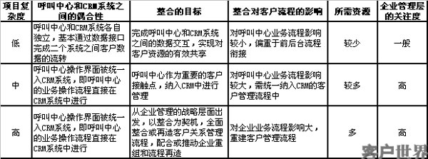表一:呼叫中心和CRM整合項目的分類