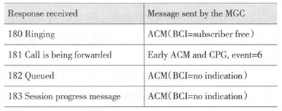 MGC收到的響應(yīng)消息中,如果是100 trying消息則網(wǎng)關(guān)不觸發(fā)任何PSTN消息。如果是18x消息,且消息體中沒(méi)有ISUP消息,此時(shí)網(wǎng)關(guān)需要判斷在此之前是否有ACM發(fā)送出去。如果之前沒(méi)有ACM發(fā)送出去,MGC將依據(jù)表1來(lái)響應(yīng)消息。