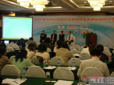 2007年11月29日,由CTI論壇主辦的,2007呼叫中心中間件應(yīng)用現(xiàn)狀及發(fā)展趨勢(shì)研討會(huì)在上海光大會(huì)展中心國(guó)際大酒店隆重召開,會(huì)議期間,來(lái)自于當(dāng)前各主流中間件廠商的專家在臺(tái)上回答參會(huì)代表的提問(wèn),與代表互動(dòng)交流,并就熱點(diǎn)問(wèn)題各抒己見(jiàn),共同探討。