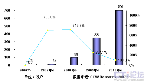 2008年,隨著3G在中國(guó)商用,以及奧運(yùn)帶來(lái)豐富視頻內(nèi)容,將推動(dòng)手機(jī)電視作為一項(xiàng)重要的移動(dòng)增值業(yè)務(wù)將進(jìn)入市場(chǎng)發(fā)展期;同時(shí)隨著網(wǎng)絡(luò)、終端、內(nèi)容、商業(yè)模式等因素的發(fā)展,產(chǎn)業(yè)鏈初步完善,看好手機(jī)電視業(yè)務(wù)的產(chǎn)業(yè)鏈各環(huán)節(jié)大力介入,北京奧運(yùn)會(huì)將大大激發(fā)用戶(hù)使用手機(jī)電視業(yè)務(wù)的熱情,從而推動(dòng)手機(jī)電視進(jìn)入快速發(fā)展階段。根據(jù)計(jì)世資訊預(yù)計(jì),2008年中國(guó)手機(jī)電視用戶(hù)將達(dá)到400萬(wàn)。