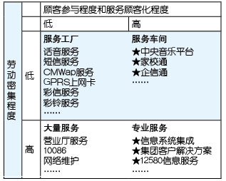 - 10086-12580信息服務。作為客戶服務中心的10086所提供的是典型的勞動力密集型服務,標準化和無差異是客戶服務提供的根本要求,而12580信息服務盡管仍然屬于勞動力密集型服務,但每一次信息服務都是獨特的,顧客的參與程度和服務的個性化都遠遠高于10086。