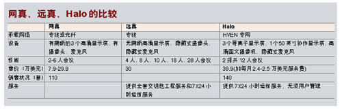 惠普的Halo工作室系統(tǒng)強調(diào)可用于企業(yè)遠程模擬面對面業(yè)務(wù)會議。通過Halo連接,每個Halo工作室可支持會議桌前排六人,第二排三至六人,最多12人的會議規(guī)模。每個工作室有三臺等離子顯示器,參會人員能夠看到與本人同樣大小的圖像。另外,參會者還可使用一個安裝在等離子顯示器上方的50英寸的協(xié)作屏幕,與其他Halo工作室中的人員共享其筆記本電腦中的文件與數(shù)據(jù)。工作室還包括一個高清圖文攝像機,可用于拍攝桌上的物品并顯示在協(xié)作顯示器上,真實呈現(xiàn)色彩、陰影與細微之處。同時配備的電話讓與會者可以與Halo工作室外的人員聯(lián)系。工作室配備了廣播質(zhì)量的音頻與照明設(shè)施,參會者可以使用屏幕上簡便的用戶界面,通過點擊鼠標開始協(xié)作。一個復雜的軟件控制系統(tǒng)將確保各個Halo工作室輕松、無縫地協(xié)同工作。