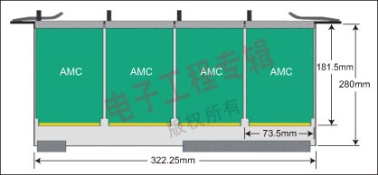 為了提高ATCA設計的模塊化性能,PICMG開發(fā)了高級夾層卡(AMC)規(guī)范。在ATVA卡上放置這些模塊后就可以使它們訪問背板連接,因此這些模塊可以用來定制ATCA卡上的I/O,并用來裝載處理器和存儲外設。一塊ATCA卡最多能夠放4個AMC模塊(見圖1),因此設計師用一個卡即可實現(xiàn)多種不同的配置。就像ATCA卡一樣,AMC模塊同樣可以實現(xiàn)單個模塊的遠程系統(tǒng)管理和熱交換功能。