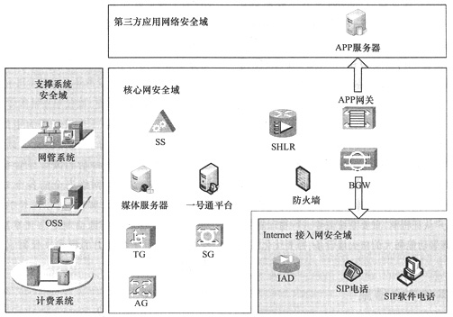 核心網安全域包括所有的軟交換機,TG、AG、SG等接入網關,BGW類設備,關鍵業(yè)務平臺(包括SHLR、號碼轉換平臺等),軟交換媒體服務器和應用服務器,開發(fā)給第三方業(yè)務接口的應用網關。Internet接入網安全域包括所有分配公網地址的SIP電話終端、IAD類設備、各類SIP接入的PC等。支撐系統(tǒng)安全域包括網管、計費和OSS等輔助運營系統(tǒng)。第三方應用網絡安全域主要包括所有以開發(fā)業(yè)務接口方式接入的應用服務器,鑒于目前實際應用中很少涉及到這種應用,這里不討論該區(qū)域的安全需求。