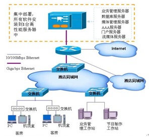 酒店客房以LAN方式接入,客房流量匯聚后上連到城域POP點業(yè)務路由器或BRAS,房間內可采用家用以太網(wǎng)交換機擴展端口以同時連接PC和STB,并通過劃分VLAN來隔離數(shù)據(jù)和視頻業(yè)務,視頻業(yè)務數(shù)據(jù)經(jīng)過BRAS后路由到中心業(yè)務平臺,Internet業(yè)務數(shù)據(jù)則路由到Internet。