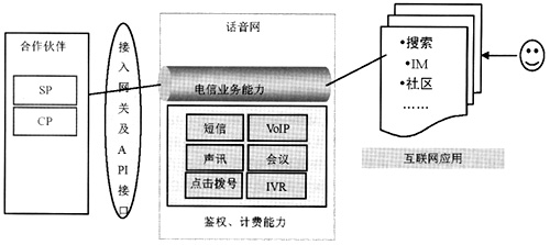 電信各種業(yè)務(wù)能力經(jīng)過(guò)封裝后以Web Services的方式向外開(kāi)放,由互聯(lián)網(wǎng)應(yīng)用調(diào)用這些服務(wù)能力,提供基于互聯(lián)網(wǎng)的新型話音型業(yè)務(wù),互聯(lián)網(wǎng)應(yīng)用提供商作為SP與電信運(yùn)營(yíng)商進(jìn)行收入分成,同時(shí)又有大量的CP作為新型話音應(yīng)用的內(nèi)容提供商加入價(jià)值鏈,運(yùn)營(yíng)商在價(jià)值鏈上充當(dāng)主導(dǎo)作用。