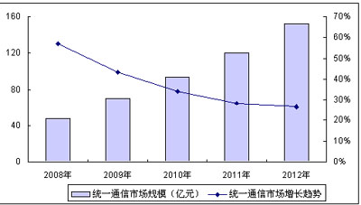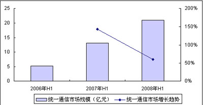 統(tǒng)一通信作為一種以融合技術(shù)為基本特征的特定解決方案和應(yīng)用,通過對各種溝通方式進(jìn)行有效的融合,滿足用戶方便快捷的信息獲取和溝通需求,近年來在全球范圍內(nèi)得到了迅猛發(fā)展,各大通信與信息技術(shù)相關(guān)廠商紛紛加入統(tǒng)一通信市場的競爭中。賽迪顧問數(shù)據(jù)統(tǒng)計顯示,2008年上半年,中國統(tǒng)一通信整體市場規(guī)模已達(dá)到21.01億元,同比增長超過60.9%,繼續(xù)保持強勁的增長勢頭。