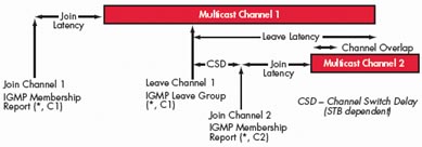 TV節(jié)目通常采用組播方式進(jìn)行傳送。組播是一種允許一個或多個發(fā)送者(組播源)一次同時發(fā)送單一的數(shù)據(jù)包到多個接收者的網(wǎng)絡(luò)技術(shù)。組播源把數(shù)據(jù)包發(fā)送到特定組播組,而只有屬于該組播組的地址才能接收到數(shù)據(jù)包。在IPTV里,組播源往往僅有一個,即使用戶數(shù)量成倍增長,主干帶寬也不需隨之增加,因為無論有多少個目標(biāo)地址,在整個網(wǎng)絡(luò)的任何一條主干鏈路上只傳送單一視頻流,即所謂“一次發(fā)送,組內(nèi)廣播”。組播提高了數(shù)據(jù)傳送效率,減少了主干網(wǎng)出現(xiàn)擁塞的可能性。對于TV系統(tǒng)而言,其所能夠支持的用戶數(shù)目僅僅受到接入網(wǎng)絡(luò)能力的限制,與前端推送系統(tǒng)的推送能力無關(guān)。因此,TV業(yè)務(wù)性能的主要測試指標(biāo)包括所推送的最大頻道數(shù)目、頻道平均帶寬、平均頻道切換時間、I幀加入延時、平均頻道離開延時、平均頻道加入延時、頻道重疊時間和頻道間隔時間。