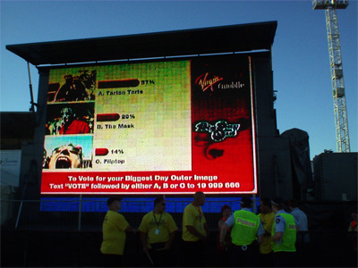 比如,某些公司可能會(huì)使用上面所述的調(diào)節(jié)型文本信息收發(fā)方式來顯示滾動(dòng)的帶狀區(qū)內(nèi)容,但也會(huì)在文本顯示的過程中覆蓋某張由手機(jī)用戶拍攝的圖象。這張圖片一般可能是該用戶的貓或狗,然后加上一些有趣的元素。在戶外活動(dòng)中,我們可以用拍到的圖象來加強(qiáng)文本信息。比如,活動(dòng)現(xiàn)場(chǎng)可以就屏幕上的一張照片提問“他夠不夠火辣?”。這樣的問答結(jié)果隨后就可以被實(shí)時(shí)廣播到屏幕上。