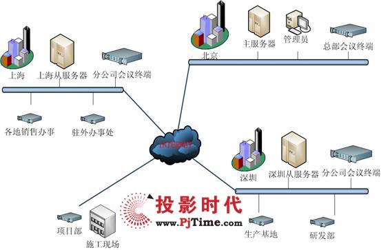 3臺(tái)高端專用服務(wù)器作為視頻會(huì)議服務(wù)器,可容納多點(diǎn)同時(shí)開會(huì),以確保系統(tǒng)的穩(wěn)定性和性能要求。主服務(wù)器放置在總公司,從服務(wù)器共2個(gè),分別放置在輻射分公司面大,位于分公司中心的兩個(gè)城市。所有接入的服務(wù)器和客戶端采用同一網(wǎng)絡(luò)服務(wù)商的線路。配置了使用1000M服務(wù)器專用網(wǎng)卡,以保證正常的音視頻信號(hào)的傳輸。并且將服務(wù)器放置在主干/核心交換機(jī)上,使服務(wù)器和客戶端的路由/交換性能達(dá)到最佳效果。其網(wǎng)絡(luò)拓?fù)鋱D如下: