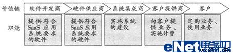 在傳統(tǒng)的軟件開(kāi)發(fā)模式下,客戶建設(shè)IT系統(tǒng)需要直接面對(duì)軟件開(kāi)發(fā)商、硬件提供商、集成商和售后技術(shù)支持,系統(tǒng)建設(shè)周期長(zhǎng)、初期投入大。在SaaS模式下,客戶只需要與服務(wù)提供商發(fā)生關(guān)聯(lián),在向服務(wù)提供商定購(gòu)業(yè)務(wù)后,客戶無(wú)需關(guān)注系統(tǒng)的軟件和硬件,可以直接使用業(yè)務(wù)。從客戶角度,從傳統(tǒng)模式發(fā)展到SaaS模式,價(jià)值鏈由并行轉(zhuǎn)變?yōu)榇。從ASP模式發(fā)展到SaaS模式,則出現(xiàn)了新的價(jià)值鏈角色服務(wù)提供商。SaaS模式下價(jià)值鏈的組成如圖3所示。
