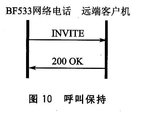 BF533網(wǎng)絡(luò)電話遠端客戶機遠端各尸機回復(fù)200 0K接受保持,如圖10所示。同理,呼叫恢復(fù)就是將c參數(shù)恢復(fù)原值,過程與呼叫保持相同。