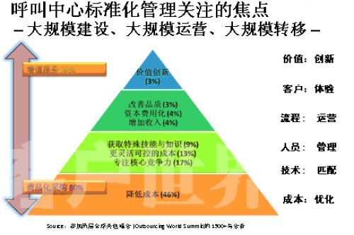 那么,對于這個尚處在”嬰兒潮”時期的產(chǎn)業(yè),我們最應(yīng)該做些什么來呵護(hù)和培育這個產(chǎn)業(yè)健康有序的發(fā)展?大家要好好呵護(hù)這個行業(yè)。如果只是強(qiáng)調(diào)“要想讓呼叫中心發(fā)展,那就需要我們多投錢,這樣就能買許多機(jī)器,放在公司里面。規(guī)格有了,那呼叫中心就發(fā)展了!蔽矣X得這樣的說法是對呼叫中心發(fā)展的錯誤理解。我們這個標(biāo)準(zhǔn)是希望營建專業(yè)化的產(chǎn)業(yè),整個呼叫中心產(chǎn)業(yè)的價值金字塔,這個金字塔每年在美國有一個專場,就叫呼叫中心專場,標(biāo)志一個產(chǎn)業(yè)成熟的金字塔是怎樣的。通過調(diào)查發(fā)現(xiàn),當(dāng)產(chǎn)業(yè)進(jìn)入成熟階段,標(biāo)準(zhǔn)化服務(wù)的第一個就是降低成本,也就是提高生產(chǎn)效益,能夠把這個產(chǎn)業(yè)細(xì)化分解,高度的模塊化進(jìn)行精細(xì)控制的時候,其他的差異化的體現(xiàn)。呼叫中心本身是不是成為企業(yè)核心競爭力的一部分,或者說越來越成熟的外包商出現(xiàn),能夠把一些企業(yè)非核心競爭力加入到自己的核心競爭力之上,這叫專業(yè)化。還有一個更加靈活可控的成本,呼叫中心的彈性從一百人到一千人,一千人到三千人的發(fā)展更加可控。還有獲得特殊技能與知識,事實(shí)上呼叫中心各行各業(yè)知識都會接觸,你只有專著才能做得更好,本身對于呼叫中心的從業(yè)人員來說,在這個產(chǎn)業(yè)中扮演的角色不是締造一個企業(yè)的核心競爭力,怎么期望從業(yè)人員掌握更多的技能和知識,來指導(dǎo)更多的行業(yè)和企業(yè)。特別是在客戶導(dǎo)向上面的發(fā)展,還有在金字塔上面增加收入,分析客戶所需,讓我們更好的滿足客戶的需求;然后資本費(fèi)用化,從外包專業(yè)化領(lǐng)域帶來的變化,很多的時候最大的一筆建設(shè)是呼叫中心,基本一個中等的呼叫中心沒有500萬以上的資金投入是不可想象的。