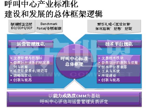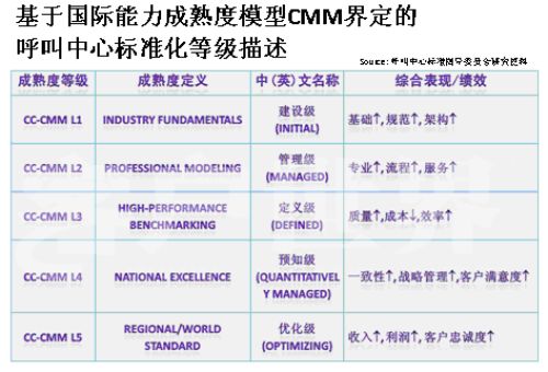 Markets)呼叫中心產(chǎn)業(yè)深入研究相結(jié)合的成果。。我在前幾年企業(yè)實(shí)施標(biāo)準(zhǔn)的時候深入研究了這套模型,這套模型對我們呼叫中心產(chǎn)業(yè)有極大的適用性,幾乎每個呼叫中心都可以在這套模型找到定位,從一個渾沌的初始過程到管理者,如果能夠建設(shè)一個持續(xù)的管控的流程到定義級,如何進(jìn)行一致化管理,再到預(yù)知級,幾乎每個呼叫中心從大到小,從年輕到發(fā)展一段時間都可以找到自己的定位,所以我們在原來的信息產(chǎn)業(yè)指導(dǎo)委員會的支持下,我們重新結(jié)合CMM模型開發(fā)出了符合我們呼叫中心發(fā)展的一個標(biāo)準(zhǔn),我建議大家把它看成是一個模型,整個國際產(chǎn)業(yè)都定性了標(biāo)準(zhǔn),因?yàn)榇蠹叶贾繡MM模型是一個開放性的知識體系,并不是一個封閉標(biāo)準(zhǔn)。CMM模型,首先你的呼叫中心建設(shè)要能夠符合呼叫中心的定義,不是找?guī)着_話機(jī)或?qū)ν庥袀一個客服號碼對外就能稱為呼叫中心。