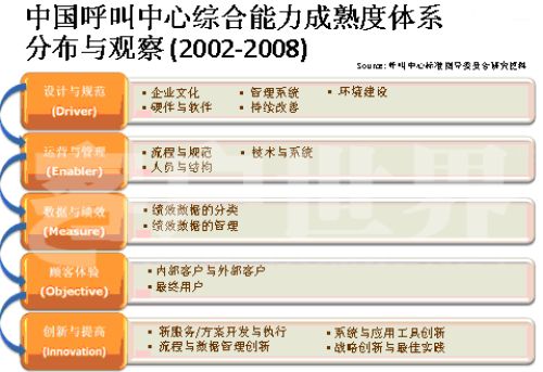 在過去幾年我們也做了很多研究,一個呼叫中心整合持續(xù)建設(shè)在哪些方面應(yīng)該做定義;旧衔覀兪欠譃槲鍌方面,在每一級的成熟度方面,我們的呼叫中心都關(guān)注自己的成熟度。1、設(shè)計(jì)與規(guī)范;2、運(yùn)營管理;3、數(shù)據(jù)與績效;4、顧客體驗(yàn);5、創(chuàng)新與提高。第五方面創(chuàng)新與提高在CMM模型中是特有的,它在整個產(chǎn)業(yè)的發(fā)展過程中,提供戰(zhàn)略革新和戰(zhàn)略工具一體化使用的指導(dǎo)框架和最佳實(shí)踐。