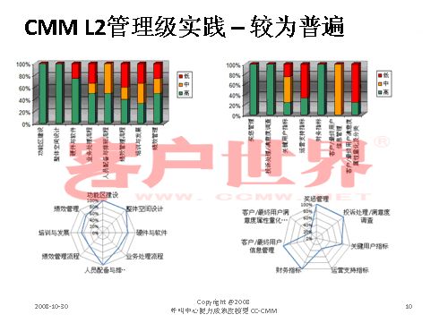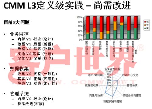 接下來我用一個很小的案例結(jié)束今天的分享,我們整個的呼叫中心的成熟度模型目前是在電信行業(yè)開始了2008年版的推廣,成熟度模型經(jīng)歷從07年成立亞太呼叫中心產(chǎn)業(yè)聯(lián)盟以后,由一群這個行業(yè)里面的專家,特別是中國產(chǎn)業(yè)市場的發(fā)展建立起的標(biāo)準(zhǔn),一年以來在通信行業(yè)我們做的能力成熟度的判定有一些很有意思的啟示,通信行業(yè)占到我們整個呼叫中心產(chǎn)業(yè)約70%的坐席,是最大的、最有代表性的產(chǎn)業(yè)。做下來真的很有代表性,普遍性在于環(huán)境建設(shè)、資產(chǎn)投入、資產(chǎn)配置,所以這下面的雷達(dá)就可以看到,相對完善都是在環(huán)境建設(shè),功能區(qū)建設(shè),整體空間設(shè)計(jì)、硬件相對來說比較偏硬的一些。在其他方面偏廢的比較厲害。第二個雷達(dá)在一些獎懲管理、信息管理,整個軟性方面幾乎有很濃重的一些計(jì)劃經(jīng)濟(jì),制造行業(yè)的一些領(lǐng)域相對來說比較成熟。我們目前看到的,基本上通信行業(yè)的一些發(fā)展在能力成熟度上是二級到四級,尤其以二到三級的發(fā)展更為普遍。通常的方法為期一周的標(biāo)桿調(diào)研,看所有的呼叫中心發(fā)展的五個方面,我們才會在里面做這樣的判定。在能力成熟度的三級,我們做了一些企業(yè)發(fā)現(xiàn),特別在三級,關(guān)于能不能對流程進(jìn)行一致性管理方面,就是剛才李老師講到的不是最急的,而管理是最重要的?赡芩械牧鞒潭喽嗌偕儆幸恍┏墒於鹊膯栴},但是我們的源頭流程能力在三個方面有很大的差距:一個是業(yè)務(wù)監(jiān)控流程,第二個數(shù)據(jù)收集流程,還有一個是管理系統(tǒng)的審核流程。這個大家可以和自己的呼叫中心比一比。