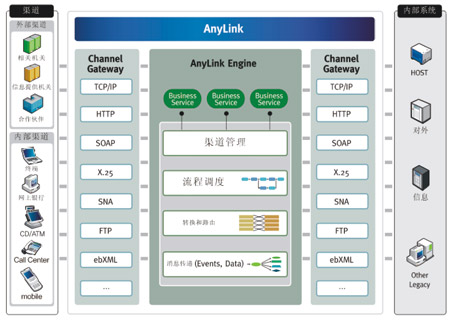 通過基于AnyLink的電子渠道統(tǒng)一接口平臺(tái)解決方案提供各類網(wǎng)關(guān)功能,可實(shí)現(xiàn)各種系統(tǒng)的整合,還提供報(bào)文轉(zhuǎn)換及路由的中介功能、管理和監(jiān)控所需的GUI工具,實(shí)現(xiàn)系統(tǒng)運(yùn)營(yíng)和維護(hù)及開發(fā)的最佳化(如圖所示)。