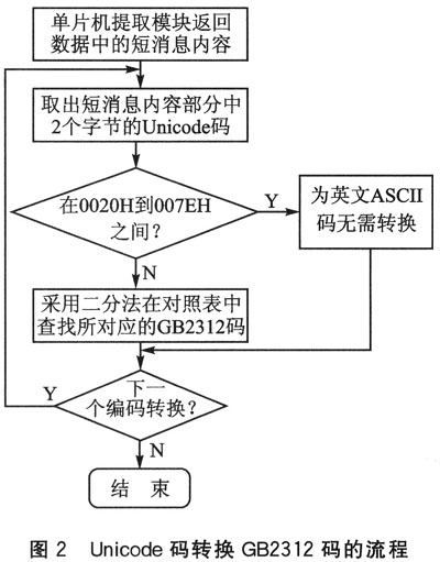 單片機通過串口與模塊連接后,發(fā)送讀取第一條新短消息指令:“AT+CMGR=1”。提取模塊接收的短消息后,先判斷其內(nèi)容是否為ASCII碼。若為ASCII碼,則無需轉(zhuǎn)換直接讀取;否則,通過查表法查找其對應(yīng)的漢字GB碼,實現(xiàn)不同編碼間的轉(zhuǎn)換。轉(zhuǎn)換流程如圖2所示。
