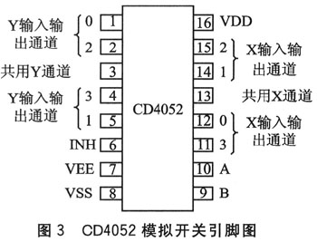51系列單片機一般只有一個串行通路,通過串口與GSM模塊連接后,則不能再連接其他串口設(shè)備;而一些串口擴展芯片成本較高,連接也較麻煩。本方法利用數(shù)控模擬開關(guān)CD4052來做多串口擴展器,成本低廉而且接線簡單。其引腳排列如圖3所示。