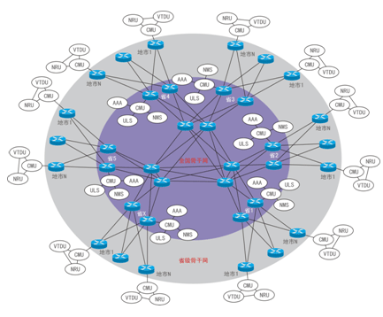 全國骨干網(wǎng)用于承載跨省監(jiān)控業(yè)務的媒體及信令傳送,省級骨干網(wǎng)用于承載跨地市監(jiān)控業(yè)務的媒體及信令傳送。全國骨干網(wǎng)與省級骨干網(wǎng)的網(wǎng)絡承載模型如下圖所示: