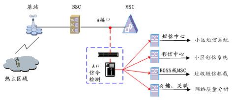 A口信令檢測(cè)的應(yīng)用非常廣泛,如網(wǎng)絡(luò)質(zhì)量分析系統(tǒng)、小區(qū)短信、小區(qū)彩信、垃圾短信攔截等。這些正成為通信運(yùn)營商的業(yè)務(wù)增長點(diǎn)。其業(yè)務(wù)應(yīng)用組網(wǎng)圖如下: