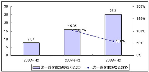 賽迪顧問數(shù)據(jù)顯示,2008年下半年,中國統(tǒng)一通信市場(chǎng)繼續(xù)延續(xù)了上半年的快速增長,整體市場(chǎng)規(guī)模超過了25.2億,同比增長58%,超過2007年全年市場(chǎng)規(guī)模。