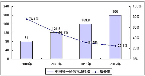 賽迪顧問預(yù)測(cè),伴隨著全球經(jīng)濟(jì)的逐漸復(fù)蘇和企業(yè)對(duì)統(tǒng)一通信產(chǎn)品認(rèn)識(shí)與需求的持續(xù)增長,2009年中國統(tǒng)一通信市場(chǎng)將出現(xiàn)加速增長的趨勢(shì),全年市場(chǎng)規(guī)模將達(dá)81億元,同比增長76.1%,至2012年,中國統(tǒng)一通信整體市場(chǎng)規(guī)模將達(dá)200億元,平均年增長率超過30%。