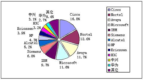 賽迪顧問預(yù)測(cè),2009年中國統(tǒng)一通信市場(chǎng)中,在通信設(shè)備領(lǐng)域,Cisco市場(chǎng)份額將達(dá)到16.8%,繼續(xù)保持領(lǐng)頭樣的位置,而且市場(chǎng)份額有望繼續(xù)增加,Nortel和Avaya緊隨其后,市場(chǎng)份額分別將達(dá)到12.6%和11.7%。而在軟件廠商方面,Microsoft和IBM將繼續(xù)保持市場(chǎng)領(lǐng)先地位,市場(chǎng)份額分別將達(dá)到11.6%和9.7%,增長勢(shì)頭強(qiáng)勁。其它市場(chǎng)份額較大的國外統(tǒng)一通信廠商還有西門子、阿爾卡特、愛立信、HP等。在國內(nèi)方面,中興和H3C分別以約3%的市場(chǎng)份額占據(jù)領(lǐng)先位置。