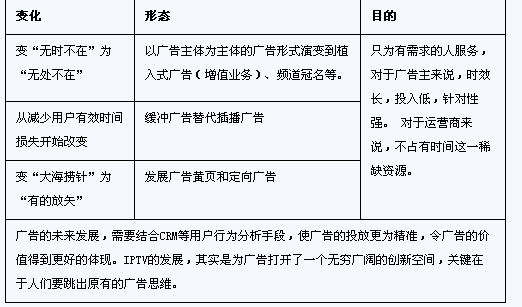 IPTV的發(fā)展,必然要經歷從量變到質變的過程,無論是視頻業(yè)務還是增值業(yè)務,隨著用戶規(guī)模的逐步擴大,將逐步轉變到以用戶為導向的互動服務上來。而如何結合用戶的需求,進行業(yè)務深化將是IPTV運營商長期面對的話題。也是產業(yè)可持續(xù)發(fā)展的關鍵。