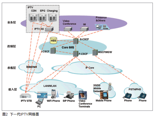 基于網(wǎng)絡(luò)視訊框架的下一代IPTV架構(gòu)堅(jiān)持業(yè)務(wù)與網(wǎng)絡(luò)、信令與媒體相分離的設(shè)計(jì)思想,以IMS為交換核心網(wǎng),以APP應(yīng)用服務(wù)器為業(yè)務(wù)引擎,以CDN為媒體分發(fā)網(wǎng)絡(luò),兼容移動(dòng)網(wǎng)絡(luò)、寬帶網(wǎng)絡(luò)和IMS/NGN網(wǎng)絡(luò),支持IPTV機(jī)頂盒、PC、智能終端,乃至3G終端(包含CS、PS域)等多樣化的類(lèi)型終端,從而提供網(wǎng)絡(luò)電視、視頻點(diǎn)播、信息服務(wù)、PVR、TSTV、游戲、視頻通信等內(nèi)容豐富且無(wú)所不在的IPTV業(yè)務(wù)。