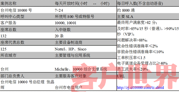 中國電信臺州市的10000客服中心,擁有100多名員工,承擔(dān)該市電信公司對外的所有客戶服務(wù)工作。中心先后被浙江省電信工會授予“先進(jìn)女職工集體”,浙江省電信分公司授予“學(xué)習(xí)型示范班組”、“創(chuàng)建學(xué)習(xí)型組織先進(jìn)班組(團(tuán)隊(duì))”,并獲得了“集團(tuán)公司優(yōu)秀10000號服務(wù)團(tuán)隊(duì)”,同時被中華全國總工會、信息產(chǎn)業(yè)部、共青團(tuán)中央授予“全國先進(jìn)女職工集體”以及“全國青年文明號”的稱號,連續(xù)兩年被信息產(chǎn)業(yè)部評定為“全國用戶滿意電信服務(wù)明星班組”。