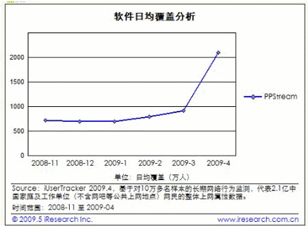 近日,艾瑞四月P2P流媒體數(shù)據(jù)出爐,PPS繼三月登頂后再次衛(wèi)冕成功。然而與三月相比較,PPS在短短一個月內(nèi)日均覆蓋人數(shù)從910.8萬人暴漲至2093.3萬人,令人乍舌的“驚變”引起了業(yè)內(nèi)人士甚至廣告主的密切關(guān)注。