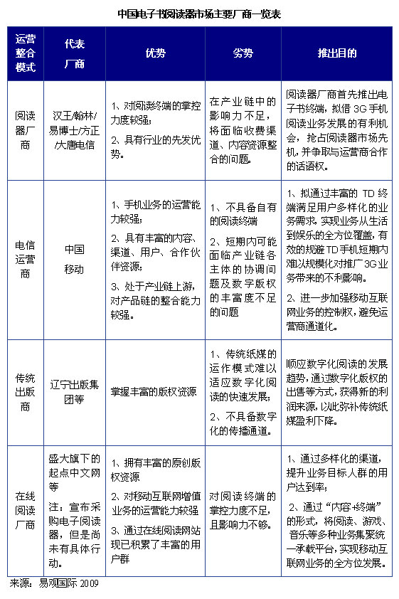 International)分析認為,目前中國電子書市場以閱讀器廠商及電信運營商兩種力量為主導,此外還包括傳統(tǒng)出版商、在線閱讀廠商等其他力量。對現(xiàn)有各種運營模式的企業(yè)分析如下: