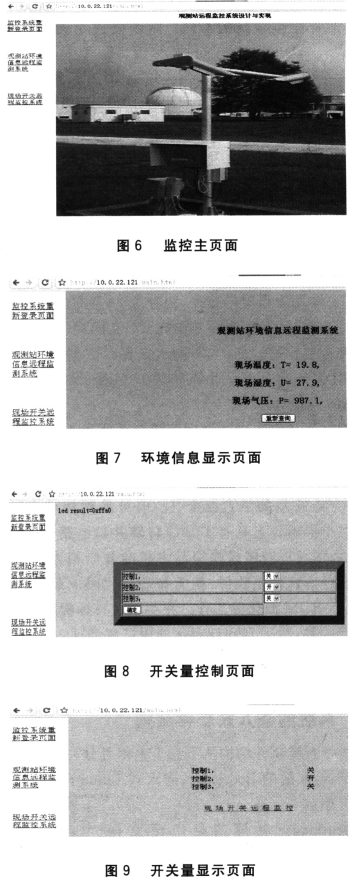 該監(jiān)控主頁面左側(cè)顯示有3個模塊:重新登陸頁面;觀測站遠(yuǎn)程環(huán)境信息檢測系統(tǒng),能方便實時地查詢現(xiàn)場的環(huán)境狀態(tài),如圖7所示;現(xiàn)場開關(guān)的遠(yuǎn)程監(jiān)控系統(tǒng),可以控制3個開關(guān)量的開關(guān),如圖8所示,并能查詢它們當(dāng)前狀態(tài),設(shè)置監(jiān)控頁面每隔15