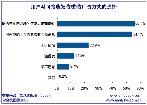 從用戶(hù)對(duì)短信廣告的接受程度來(lái)看,用戶(hù)對(duì)于自己感興趣領(lǐng)域的短信廣告并不反感,甚至樂(lè)于接受或定制。根據(jù)易觀國(guó)際Enfodesk發(fā)布的用戶(hù)調(diào)研數(shù)據(jù),56.1%的用戶(hù)愿意定制自己感興趣的信息,54.1%的用戶(hù)愿意接受會(huì)員信息,只有8.7%的用戶(hù)不愿意接受任何形式的短信/彩信廣告。但是這類(lèi)用戶(hù)樂(lè)于接受的短信廣告反而一般有固定的端口號(hào),更容易被攔截,因此易觀國(guó)際(Analysys