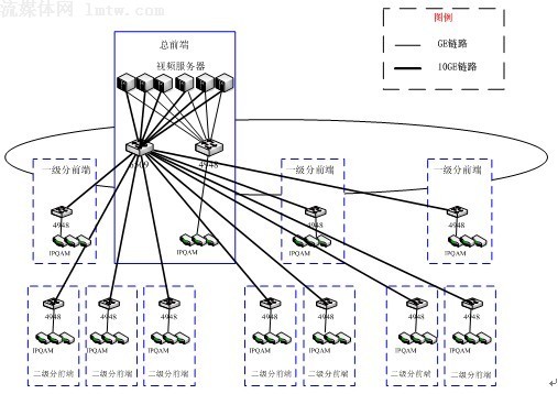 方案二:全集中式。在總前端集中部署若干臺(tái)視頻服務(wù)器,通過萬兆網(wǎng)絡(luò)直接向各分前端提供視頻流服務(wù);示意圖如下: