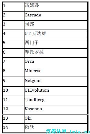 在中國市場(chǎng)上,UT 斯達(dá)康和中興公司暫時(shí)領(lǐng)先于其他公司。其中,UT 斯達(dá)康在海外也有不俗的表現(xiàn),如在印度和日本市場(chǎng)等;華為公司可以借助其整體解決方案的實(shí)力,有機(jī)會(huì)在下一代基于IMS 的IPTV 解決方案中脫穎而出。MRG 曾經(jīng)在2007 年3 月公布過一個(gè)市場(chǎng)調(diào)查,對(duì)IPTV 中間件及其市場(chǎng)影響力進(jìn)行了一個(gè)排名,具體的結(jié)果見表1。