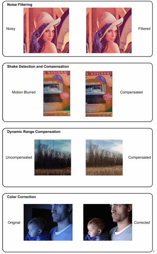 圖: 四種預(yù)處理算法示例:噪聲濾波、抖動(dòng)檢測與補(bǔ)償、動(dòng)態(tài)范圍補(bǔ)償和顏色校正。