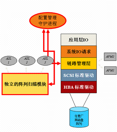 該技術的特點是通過主機層軟件方式建立存儲管理虛擬層,利用專業(yè)的第三方鏈路管理軟件解決磁盤陣列和主機的連通兼容性。其運行依靠工作在存儲網絡鏈路管理層的軟件程序來完成,其體系架構圖如下: