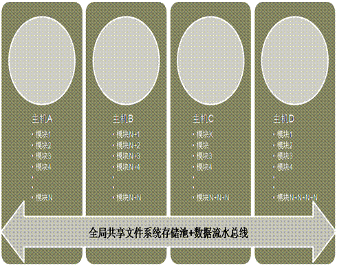 該技術方案是依靠在存儲管理虛擬層上構建并行文件系統(tǒng),實現(xiàn)所有業(yè)務主機共享同一份數(shù)據視圖,實現(xiàn)并發(fā)數(shù)據共享訪問的架構設計方案。其架構示意圖如下: