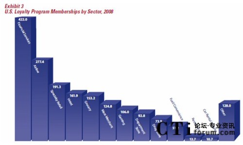 在美國,忠誠度營銷應(yīng)該用為廣泛的五個(gè)行業(yè)/領(lǐng)域是金融服務(wù)(銀行、保險(xiǎn)、證券、基金等)、航空、專門零售(例如各類的專賣店、品牌連鎖)、酒店及百貨。值得一提的是,近兩年來,金融服務(wù)行業(yè)在忠誠度營銷的應(yīng)用發(fā)展迅速,各類忠誠度計(jì)劃的參與人數(shù)由2006年的2.388億上升到2008年的4.22億,這個(gè)增長主要是由各類具備信用卡、借記卡功能的聯(lián)名卡發(fā)行所致。