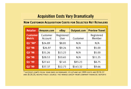 上世紀90年代末期DOT.COM就遭遇了這一嚴峻問題。70% - 80%的客戶在沒有完成采購之前就棄網(wǎng)站而去。對于許多人來說這被認為是一個“行業(yè)基準(zhǔn)”,屬于可接受水平,但也有些人開始尋找解決方案。整個行業(yè)開始注意到分析家們的忠告:這一水平的放棄率是不被允許的。下面這張由Yankee集團在2000年發(fā)布的表格向我們展示了電子商務(wù)企業(yè)客戶獲取成本螺旋形盤升的過程。