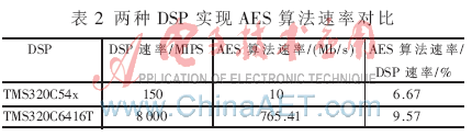 兩種處理器的架構和處理速度是不同的,在軟件設計上會有不同的處理方法,若僅考慮DSP速率對算法速率的影響,本系統(tǒng)加密效率更高。另外,本測試僅考慮了AES加密算法代碼的指令開銷,實際中還要考慮DSP存取數(shù)據(jù)、中斷處理等其他任務。