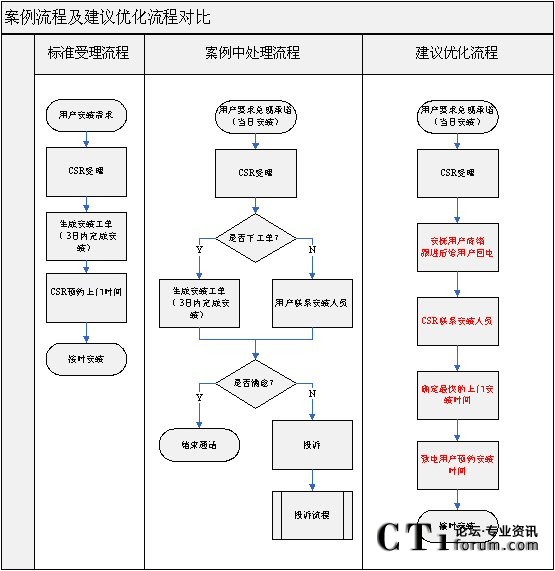 通過對比,很明顯后者減少了流程中的關(guān)鍵角色,提高了流程的執(zhí)行效率。CSR直接為用戶提供了“一站式服務(wù)”,用戶只需要通過一個(gè)電話便能解決問題,而至于CSR與安裝人員的工作協(xié)調(diào),完全不需要用戶去介入。