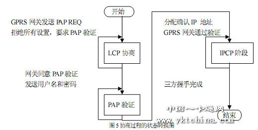 系統(tǒng)的一個(gè)難點(diǎn)是微控制器登陸 GPRS 網(wǎng)關(guān)(GGSN)并與網(wǎng)關(guān)通過(guò)LCP、PAP、IPCP 協(xié)議進(jìn)行協(xié)商的過(guò)程。LCP、PAP 與IPCP 協(xié)議的幀結(jié)構(gòu)大同小異,最常用的為請(qǐng)求(REQ)、同意(ACK)和拒絕(NAK)三種幀。微控制器與GGSN 各為一方進(jìn)行協(xié)商,任何一方都可以發(fā)送REQ 幀請(qǐng)求某方面的配制,另一方覺(jué)得配置不能接受會(huì)回應(yīng)NAK 幀,如果可以則回應(yīng)ACK 幀。為了節(jié)省資源,我們只處理這三種數(shù)據(jù)幀,其它鏈路問(wèn)題都由微控制器在程序控制下自己重新?lián)芴?hào)解決。協(xié)商過(guò)程大致描述如下:在撥號(hào)成功連接后,GGSN 首先會(huì)返回一個(gè)PAP REQ 數(shù)據(jù)幀。我們發(fā)送一個(gè)空 LCP REQ 幀,以強(qiáng)迫進(jìn)行協(xié)議協(xié)商階段。隨后,GGSN 發(fā)送LCP 設(shè)置幀,我們拒絕所有的設(shè)置并請(qǐng)求驗(yàn)證模式。GGSN 選擇CHAP 或PAP 方式驗(yàn)證,我們只接受PAP 方式。然后,進(jìn)行PAP 驗(yàn)證用戶(hù)名和密碼過(guò)程,在GPRS 中用戶(hù)名與密碼都為空,如果成功,GGSN 會(huì)返回IPCP報(bào)文分配動(dòng)態(tài)IP 地址。此時(shí),就完成了與GGSN 的協(xié)商過(guò)程。協(xié)商過(guò)程的狀態(tài)轉(zhuǎn)換如圖5 所示。