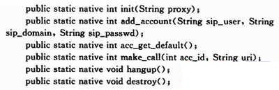 PJSIP庫(kù)和Java類(lèi)連接是通過(guò)JNI來(lái)實(shí)現(xiàn)的,這也是Android NDK的實(shí)現(xiàn)機(jī)制,JNI是SUN公司推出的用于Java調(diào)用其他語(yǔ)言的接口。