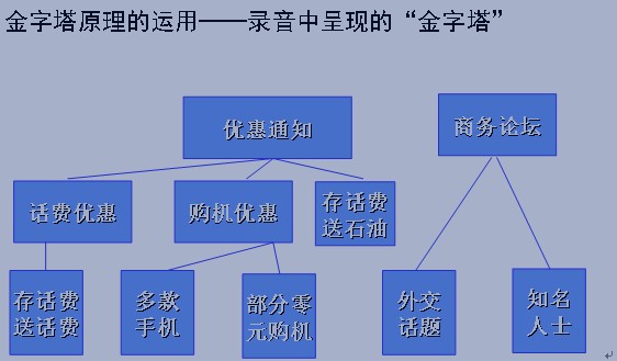 在錄音分享之前,首先慧聰鄧白氏研究人員跟電客們交流了金字塔理論的原理,說(shuō)明金字塔對(duì)寫(xiě)作、思考和分析問(wèn)題的過(guò)程可進(jìn)行指導(dǎo)。接著是聽(tīng)錄音,讓電客根據(jù)金字塔原理討論、分析錄音的優(yōu)缺點(diǎn)。然后慧聰鄧白氏研究研究員把事先從錄音中聽(tīng)到的金字塔結(jié)構(gòu)呈現(xiàn)出來(lái),如下所示: